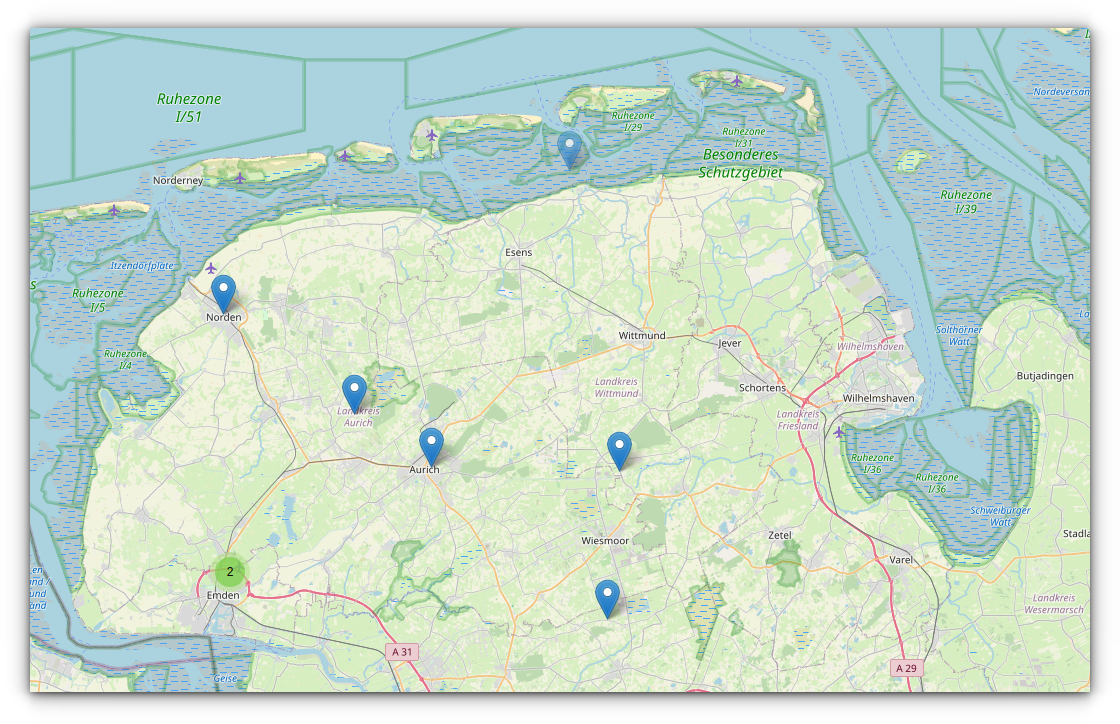 Obwohl ich mich im ländlichen Raum bewege und sich die Funkwellen frei ausbreiten können, beträgt die Reichweite tatsächlich nur wenige Kilometer. Und wie man auf der Karte unschwer erkennen kann, gibt es in ganz Ostfriesland kaum aktive Nodes. Meine beiden Tracker tauchen hier gar nicht auf, was wohl daran liegt, dass sie sich mangels Verfügbarkeit bisher mit keiner anderen Node verbinden konnten.